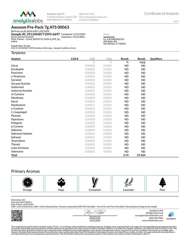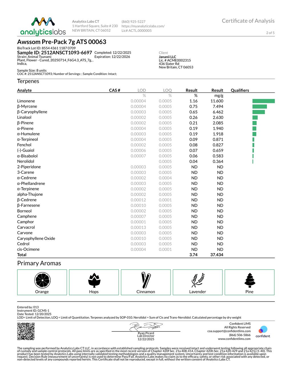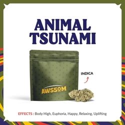 A super delicious bud with an even more delightful high, Animal Tsunami is a great choice for any fan of soothing indica strains. This bud has a mouthwateringly sugary and creamy nutty caramel taste with hints of woody pine to it, too. The aroma is very similar, with a sugary nutty cookie overtone accented by woody pine and earthy, spicy herbs. The Animal Tsunami high will settle in a few moments after your final toke, filling your mind with a near immediate sense of lifted yet calming euphoria. You'll feel mentally at ease, free of any bad moods, negative vibes or racing thoughts to speak of. A relaxing body high finishes everything out, settling into your limbs and leaving you feeling slightly couch-locked and totally at ease.