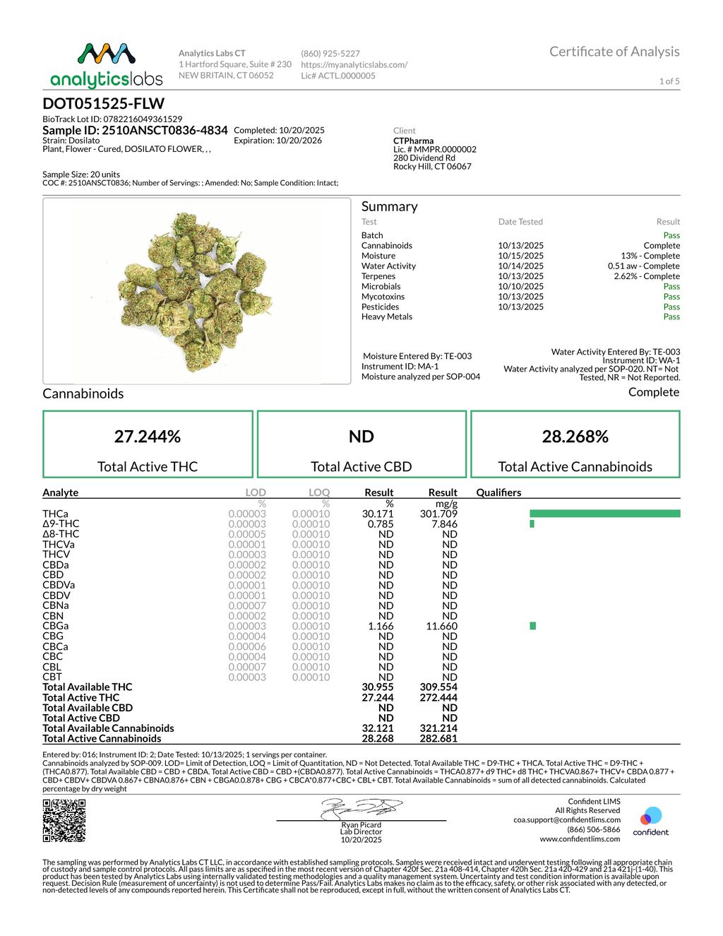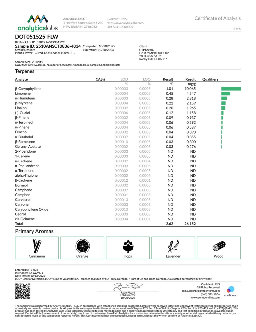 Dosilato has a beautiful range of colors in its colas—from light to dark green and red-wine purple to bright orange, all dusted with diamond-like trichomes. Dosilato’s terpene profile features a fruity, earthy scent followed by a sweet lavender taste.