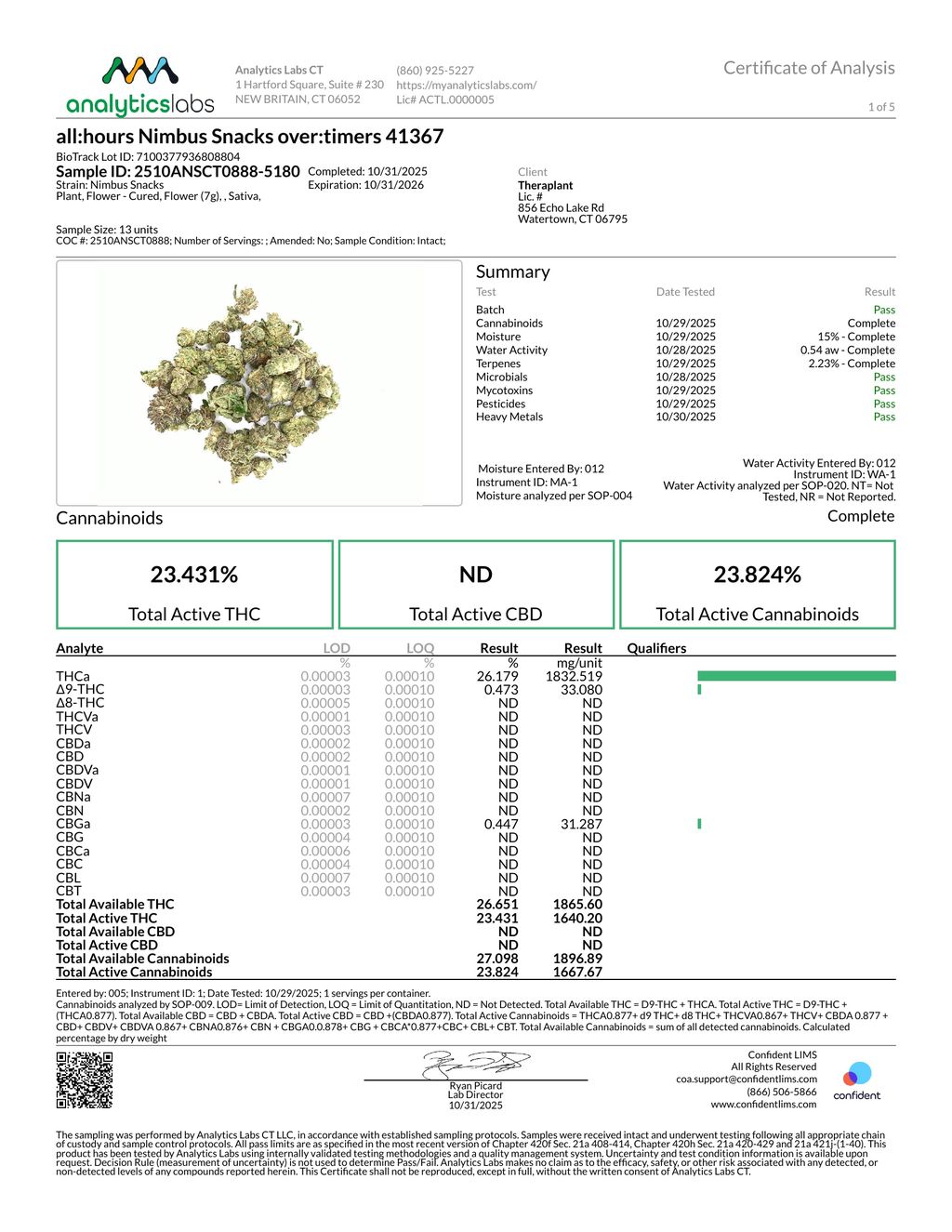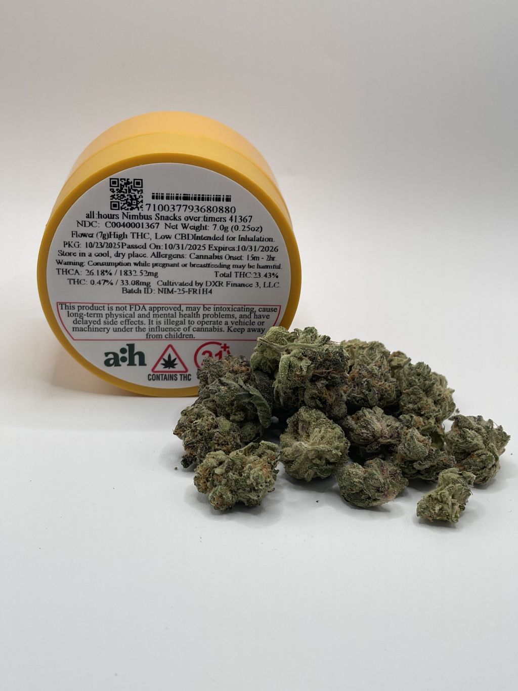 The all:hours Nimbus Snacks strain is a sativa strain with uplifting, energizing, and mentally stimulating effects, making it best for daytime use. It has a fruity, citrus, and spicy aroma and flavor and is bred from Durban Mintz and GSC. The effects can include heightened focus, creativity, and mood elevation.