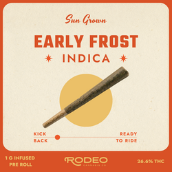Drift into a cool, calming serenity with Rodeo Sun Grown Early Frost, an indica preroll crafted from premium outdoor flower nurtured under open skies. This smooth-burning 1g preroll delivers a grounded, body-soothing experience highlighted by its potent 26.6% THC. Expect a chilled, frosty relaxation that settles in quickly—perfect for easing into the evening or slowing down a busy day. Sun-grown purity meets indica tranquility in this crisp, refreshing smoke.