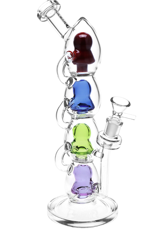 The Pulsar Stacks on Stacks Glass Water Pipe stands 11.75 inches (29.8cm) tall and is made of premium borosilicate glass with a wide stable base. It has an exterior fixed downstem and a unique quad-chamber design, each one encasing a perforated showerhead percolator for four times the filtration. Includes a funnel style herb slide with a tab handle.